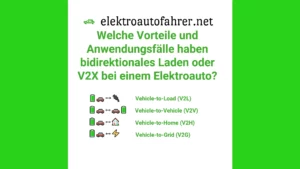 Elektroauto bidirektionales Laden Vehicle to X V2H V2G V2V V2LVon Daniel Sonne / 20. Juni 2023 Elektroauto als Stromspeicher und Vorteile sowie Anwendungsfälle des bidirektionalen Ladens.